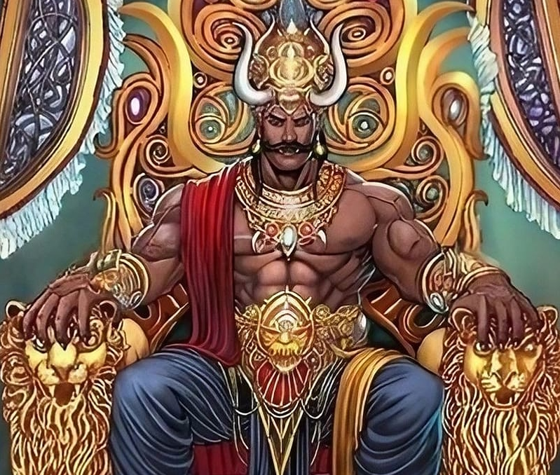 Ravana’s body was solid muscle, and his loose-fitting clothes were made of the finest silks. He wore a golden band around each of his biceps, and an enormous crown sat upon his head.