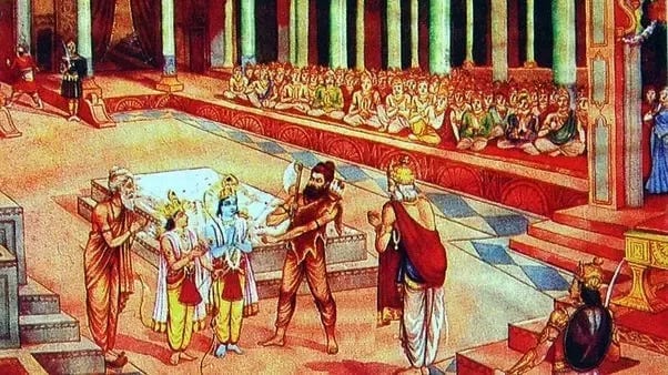 Janak began to relate the story behind the Swayamvara as Parashurama looked around. His eyes settled on the broken bow. Interrupting the king, he growled, “And tell me, Your Idiotic Majesty, who has broken the bow of Shiva?”