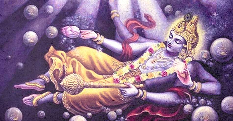 The delegation of Devas made the cross-galactic pilgrimage to Vishnu’s home, the spiritual planet Vaikuntha. At first, they sought him at his vast Crystal Palace. Upon arrival, a servant informed them that Lord Narayana (another name for Vishnu) slept for a third of each year and was currently engaged in his four-month sleep period. He could be found on the cosmic sea, where he and his wife Lakshmi rested on the back of the great cobra, Shesh.